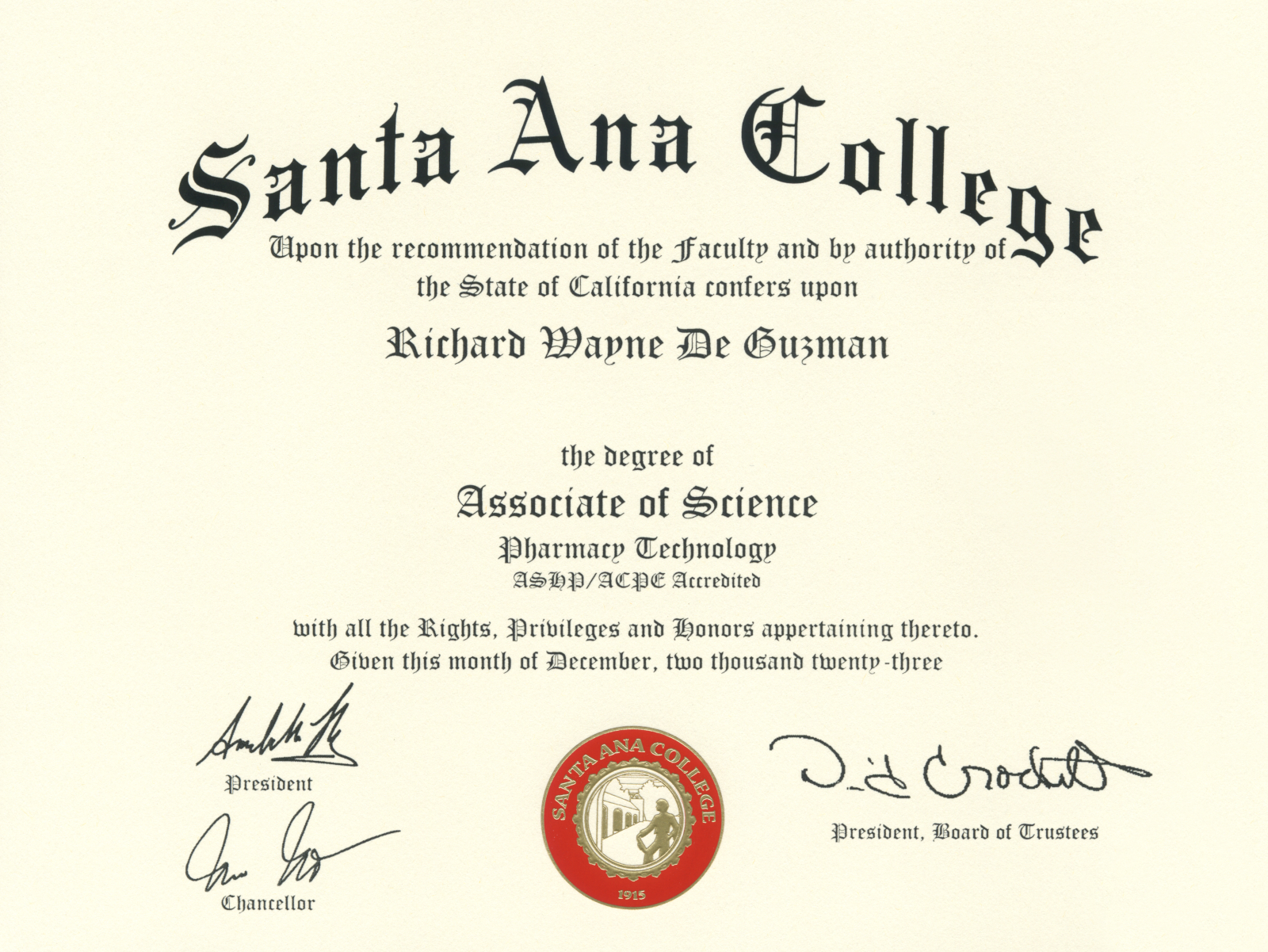 Santa Ana College Associate of Science in Pharmacy Technology, ASHP/ACPE Accredited